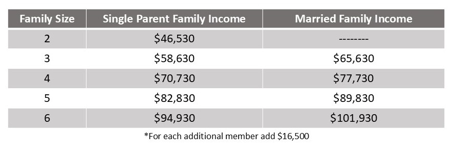 To meet the income requirements for the program a student’s family must have an Adjusted Gross Income at or below 220% of the federal poverty level, with an additional $7,000.00 allowed for a married couple as illustrated in the table below.